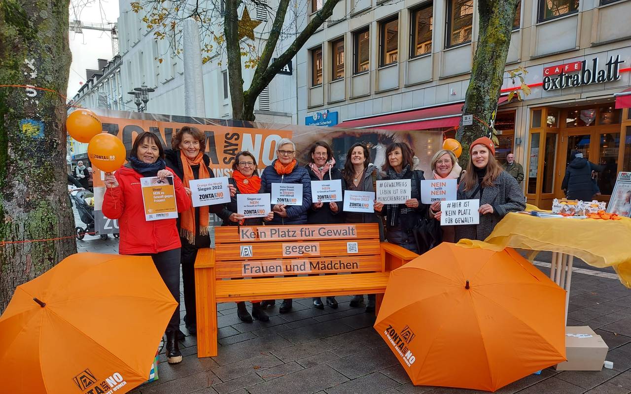 139 Paar Schuhe sind am Freitag auf der Oberstadtbrücke in Siegen abgestellt worden - viele davon orange angesprüht. Mit dieser Aktion macht der Soroptimist International Club Siegen am "Internationalen Tag gegen Gewalt an Frauen" darauf aufmerksam, dass letztes Jahr in Deutschland 139 Frauen durch häusliche Gewalt verstorben sind. Ein paar Meter weiter in der Fußgängerzone Bahnhofstraße steht nun eine leuchtend orange Sitzbank. Sie ist vom Zonta-Club Siegen aufgestellt worden.