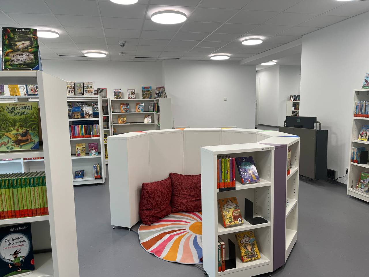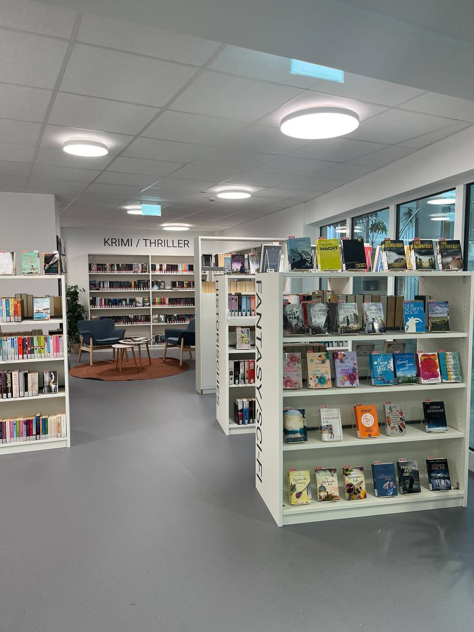 Es gibt Leseecken für Kinder und Erwachsene – das Ganze mit hellen Regalen und ganz vielen Büchern, von Krimis über Sachbücher bis hin zu Büchern für Kinder und Jugendliche.