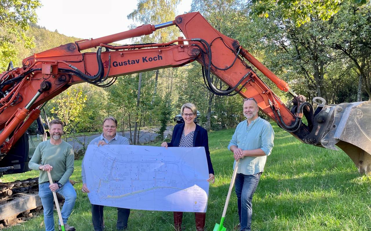 Das Baugebiet „Auf’m schmalen Hainchen“ im Freudenberger Ortsteil Mausbach nimmt konkrete Formen an. Bürgermeisterin Nicole Reschke traf sich mit Ortsvorsteher Stephan Marx, der ausführenden Baufirma und dem Planer zum Spatenstich und gab das Startsignal für die Umsetzung der Erschließung. Die aktuellen Pläne sehen um die 20 Bauplätze für Einfamilien- und Doppelhäuser vor. „Der exakte Zuschnitt der Grundstücke und damit die Gesamtzahl kann sich im Verlauf der Vermarktungszeit eventuell noch leicht verändern“, erklärte Bürgermeisterin Reschke. Sie freut sich darauf, dass mit dem neuen Baugebiet weitere attraktive Ansiedlungsmöglichkeiten im Stadtgebiet geschaffen werden, die nun bald bebaut und mit Leben gefüllt werden können. Für den Verkauf der teils städtischen Grundstücke werden aktuell Kriterien erarbeitet, die zum Ende des Jahres mit den politischen Gremien abgestimmt werden. Ortsvorsteher Stephan Marx sieht in der Bebauung eine Stärkung der Ortschaft und die Chance, Zugezogene herzlich willkommen zu heißen und ins Dorfleben einbeziehen zu können.