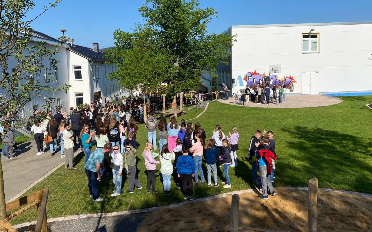 Grün statt grau: der Schulhof der Gemeinschaftlichen Sekundarschule in Neunkirchen hat sich in einen "Coolen Schulhof" verwandelt.