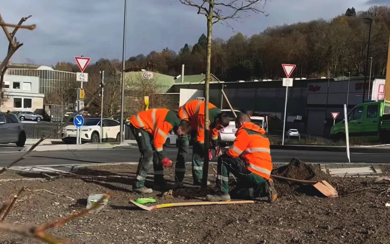 Beschäftigte der Grünflächenabteilung der Stadt Siegen bepflanzen aktuell das Innere des neuen Kreisverkehrs am Schleifmühlchen in Siegen. Laut Stadtverwaltung werden Amberbäume, Gleditschien und Kupferfelsbirnen gepflanzt. Für diese Arbeiten wird der sogenannte Bypass am Kreisel vorbei von der Marienborner Straße direkt auf die Frankfurter Straße heute und morgen für den Verkehr gesperrt. Ihr könnt aber durch den Kreisel fahren.