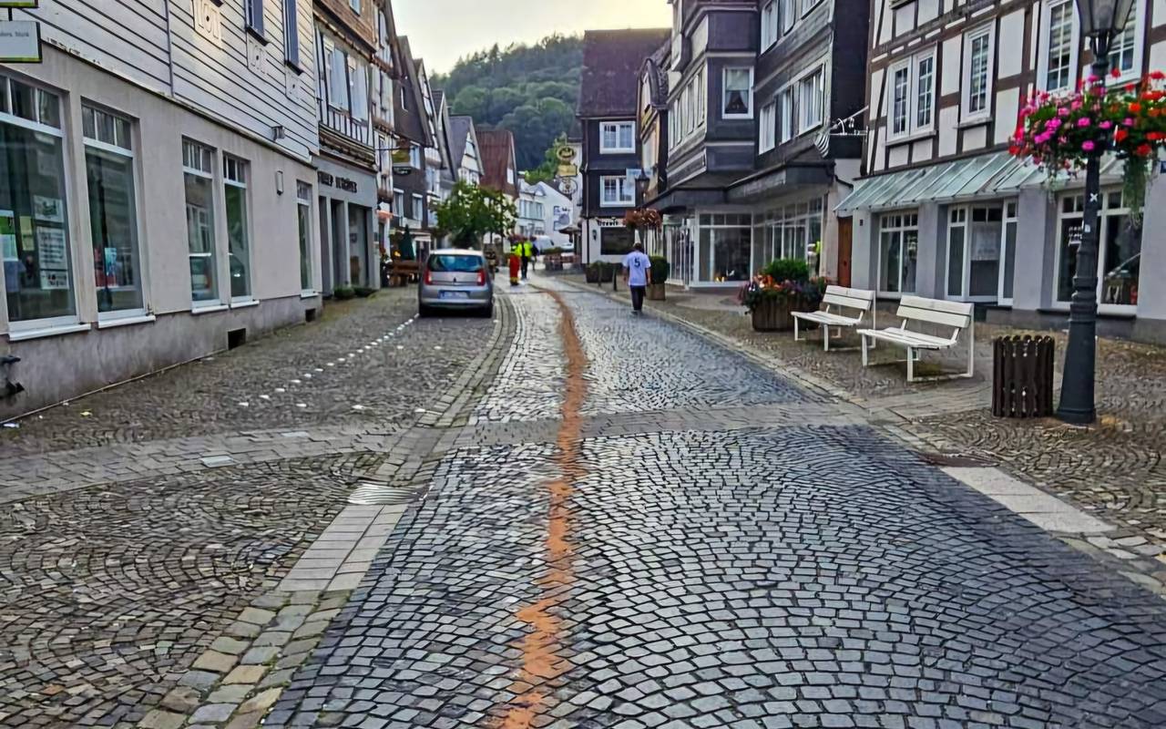 Eine lange Dieselspur hat sich am Montagabend durch die Königstraße in der Altstadt von Bad Laasphe gezogen. Die Bad Laaspher Feuerwehr rückte aus, um den ausgetretenen Treibstoff abzubinden. Eine Fachfirma hat anschließend die gepflasterte Königstraße gründlich gereinigt. Die Polizei konnte den Verursacher ermitteln. Demnach war der Diesel aus einem VW Golf ausgetreten.