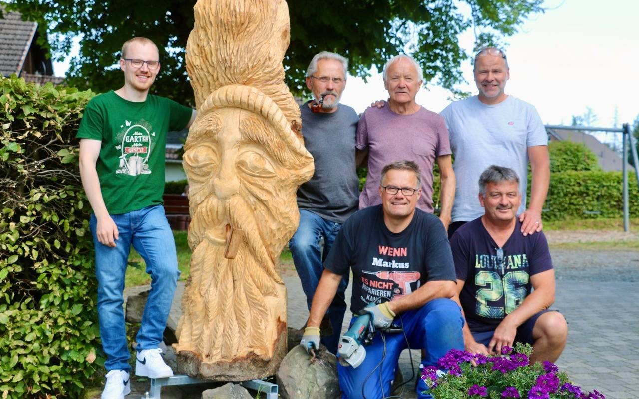 Im Bereich des Backes von Mausbach steht eine neue Holzskulptur. Robin Rosenthal aus Niederfischbach hat sie mit der Motorsäge aus einer in Mausbach gefällten, riesigen Fichte geschnitzt. Sie zeigt das überlebensgroße Gesicht eines Mannes mit Pfeife im Mund. In zwei Wochen dürfte die Skulptur hundertfach bewundert werden, denn dann findet in Mausbach das traditionelle Backesfest statt.