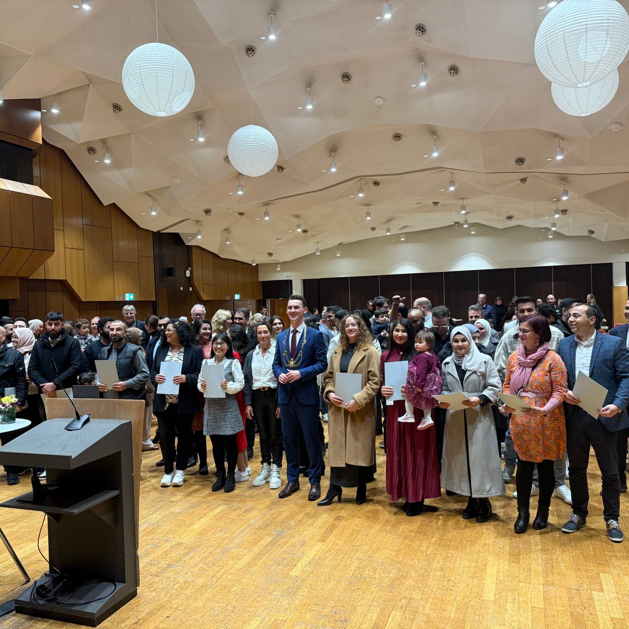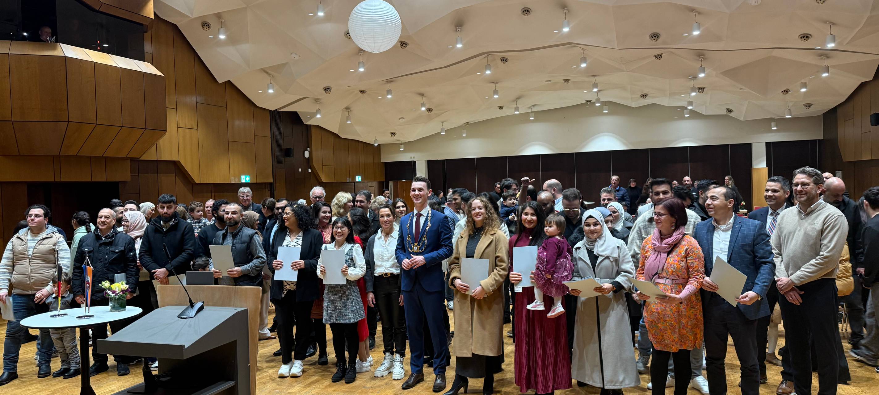Feierlicher Moment in Weidenau: In der Bismarckhalle haben gestern Abend rund 90 Siegener aus unterschiedlichen Nationen ihre deutsche Staatsbürgerschaft erhalten. Für Bürgermeister Tristan Vitt war es die erste Einbürgerungsfeier seiner Amtszeit. Er überreichte Urkunden und Exemplare des Grundgesetzes. Nach dem gemeinsamen Singen der Nationalhymne lud die Stadt auf einen Imbiss und Gespräche untereinander und mit Vitt ein. Für ihn war die Zeremonie ein besonderer Moment: