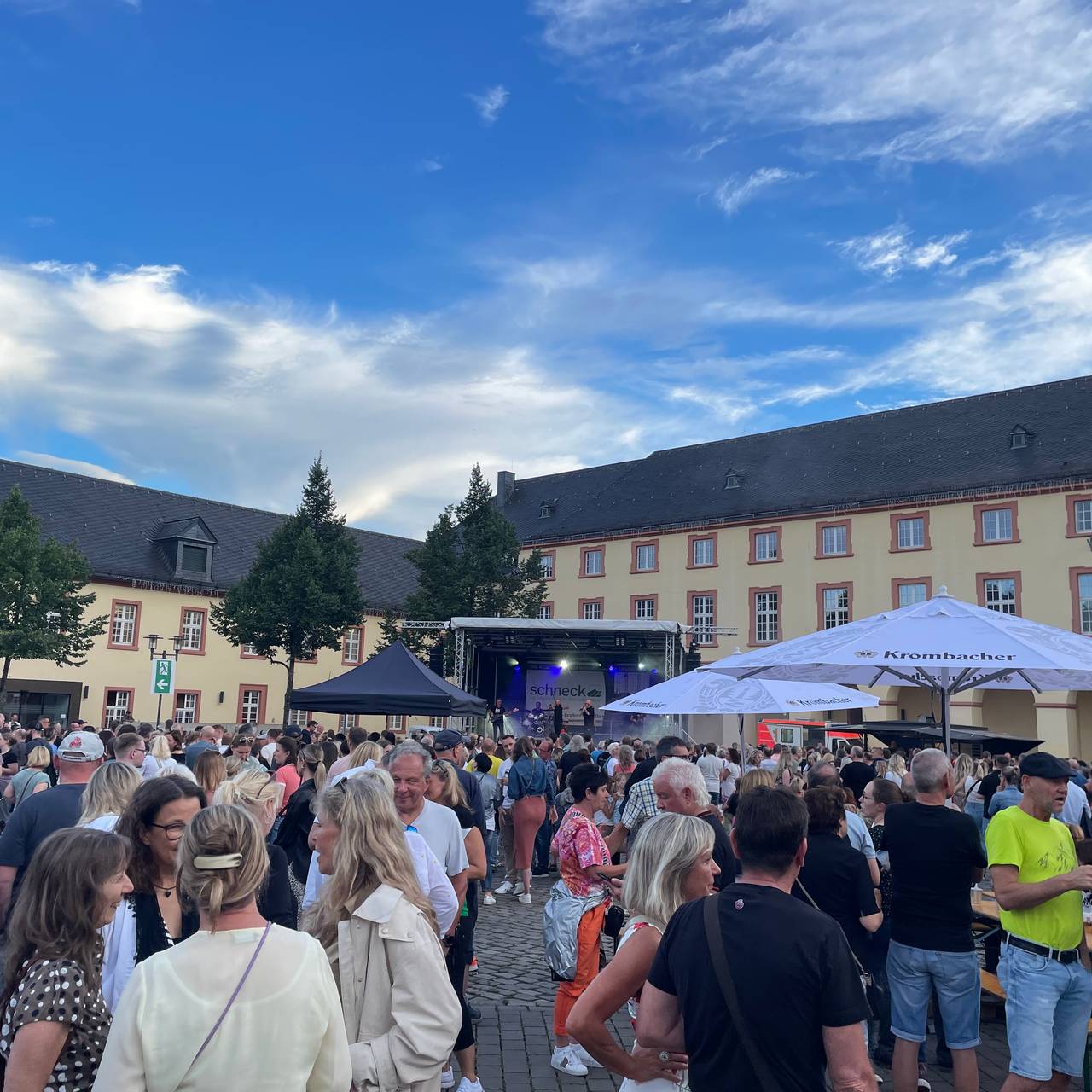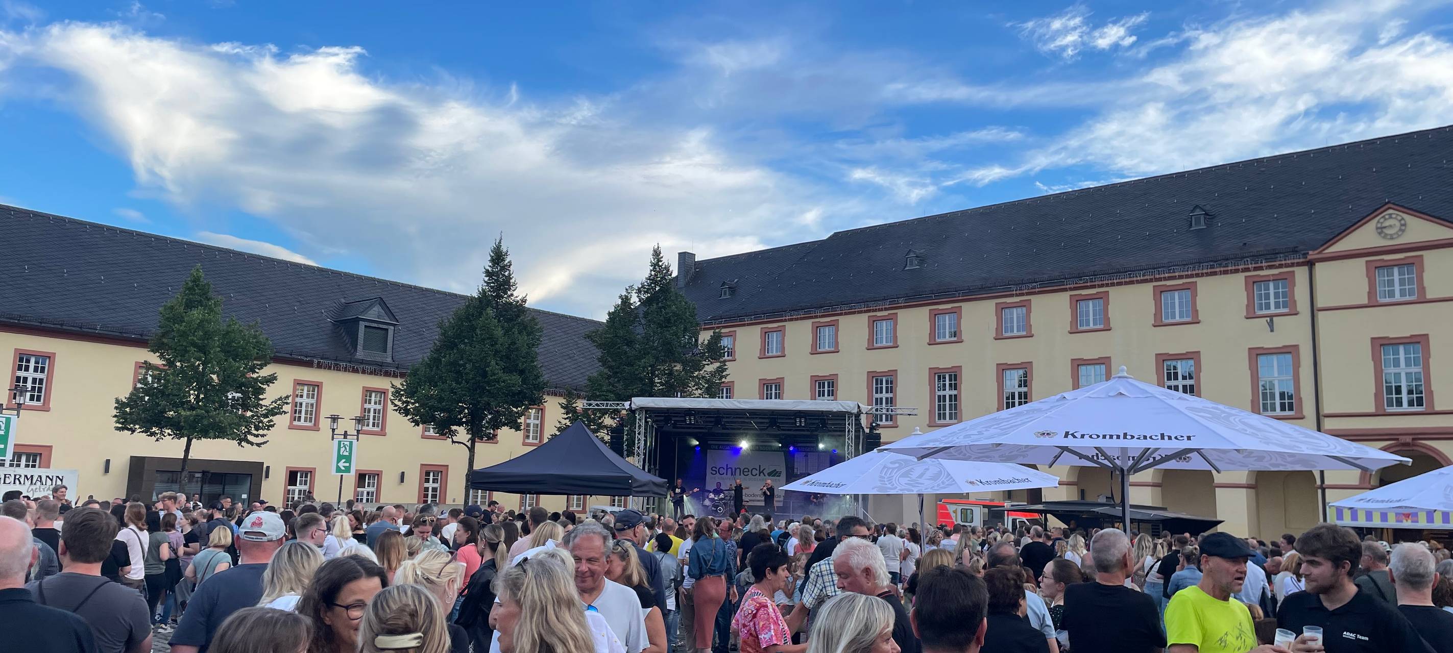 Bei guter Musik mit Freunden unter freiem Himmel einen entspannten Abend verbringen - dafür steht in Siegen seit 24 Jahren die Open-Air-Musikreihe “mittwochSin”. Proppenvoll war Mittwochabend zum Auftakt der diesjährigen “mittwochSin”-Saison der Schlossplatz. Die Band “Hörgerät” spielte gemeinsam mit dem Rapper MEMO vor der Kulisse des Unteren Schlosses. Knapp 3000 Besucherinnen und Besucher feierten die Band, bevor das Konzert wetterbedingt abgebrochen werden musste:
