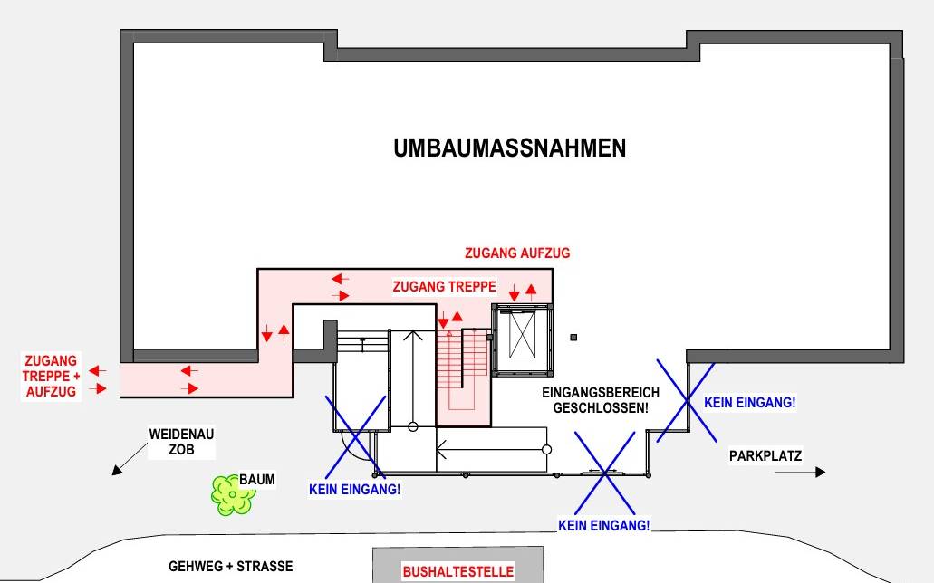 Derzeit laufen die Arbeiten auf Hochtouren: das alte Tonnenvordach wird abgerissen. Um die Sicherheit der Reisenden zu gewährleisten, führt ein Schutztunnel sie in den kommenden Wochen sicher zu den Bahnsteigen und zurück. Bis Oktober soll der neue Eingangsbereich fertiggestellt sein, sodass der Zugang zu den Gleisen wieder wie gewohnt möglich ist.