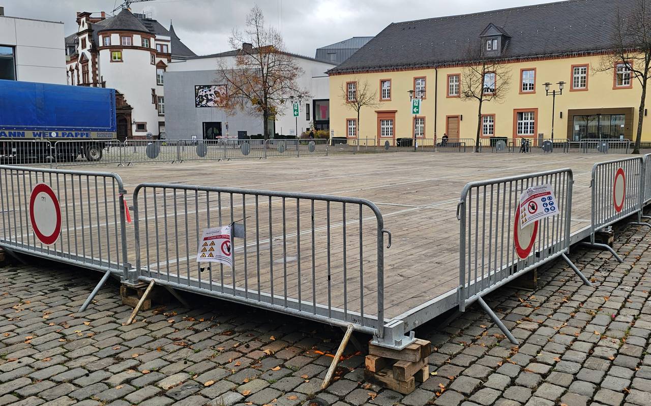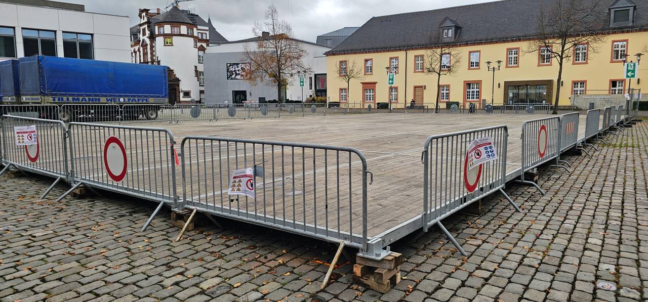 Auf dem Schlossplatz in Siegen haben die Aufbauarbeiten für den diesjährigen Weihnachtsmarkt begonnen.