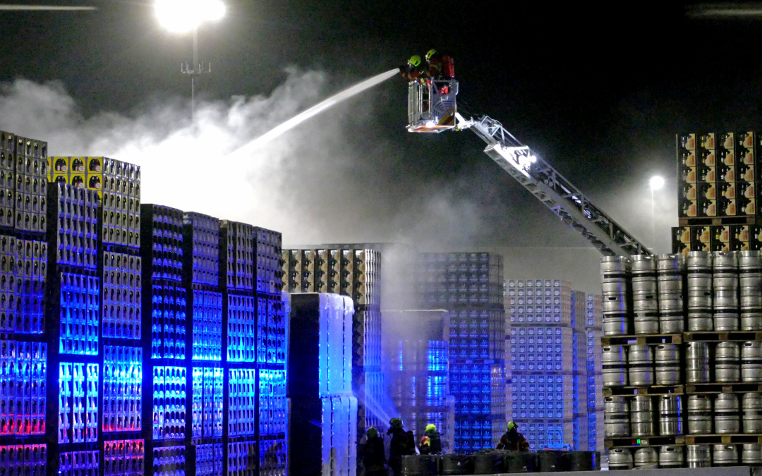 Nach dem Großbrand auf einem Lagergelände der Krombacher Brauerei im Littfetal in Krombach in der Neujahrsnacht dauern die Ermittlungen der Kriminalpolizei zur Brandursache an.
