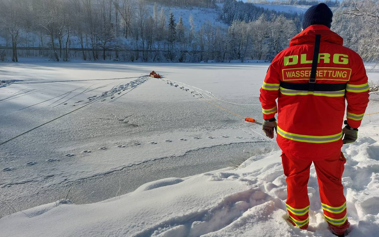 35 Einsatzkräfte der DLRG haben am Samstag an einer Übung an einem zugefrorenen Weiher bei Seelbach teilgenommen. Bei einer Außentemperatur von minus 9 Grad wurde die Rettung von Personen aus einem zugefrorenen Gewässer geübt. Dabei sind unterschiedliche Hilfsmittel eingesetzt worden – neben einem speziellen Eisretter wurde auch mit Leitern und einem Schlauchboot gearbeitet. Neben der DLRG-Ortsgruppe Siegen waren auch Kräfte aus Eiserfeld und Bad Berleburg beteiligt, außerdem die Feuerwehr Siegen.
